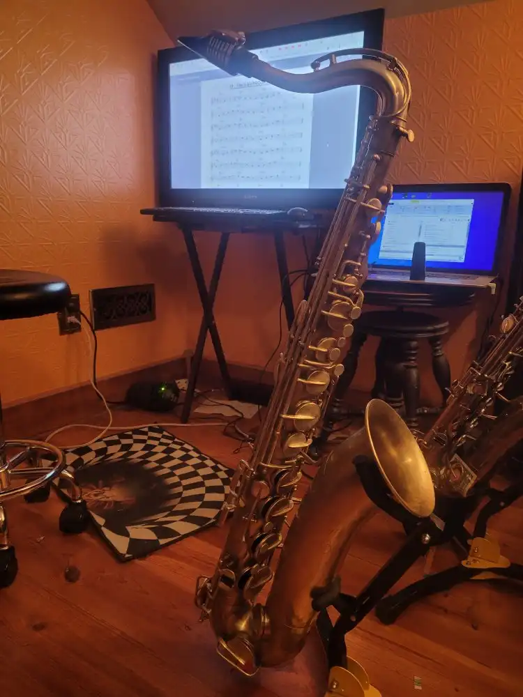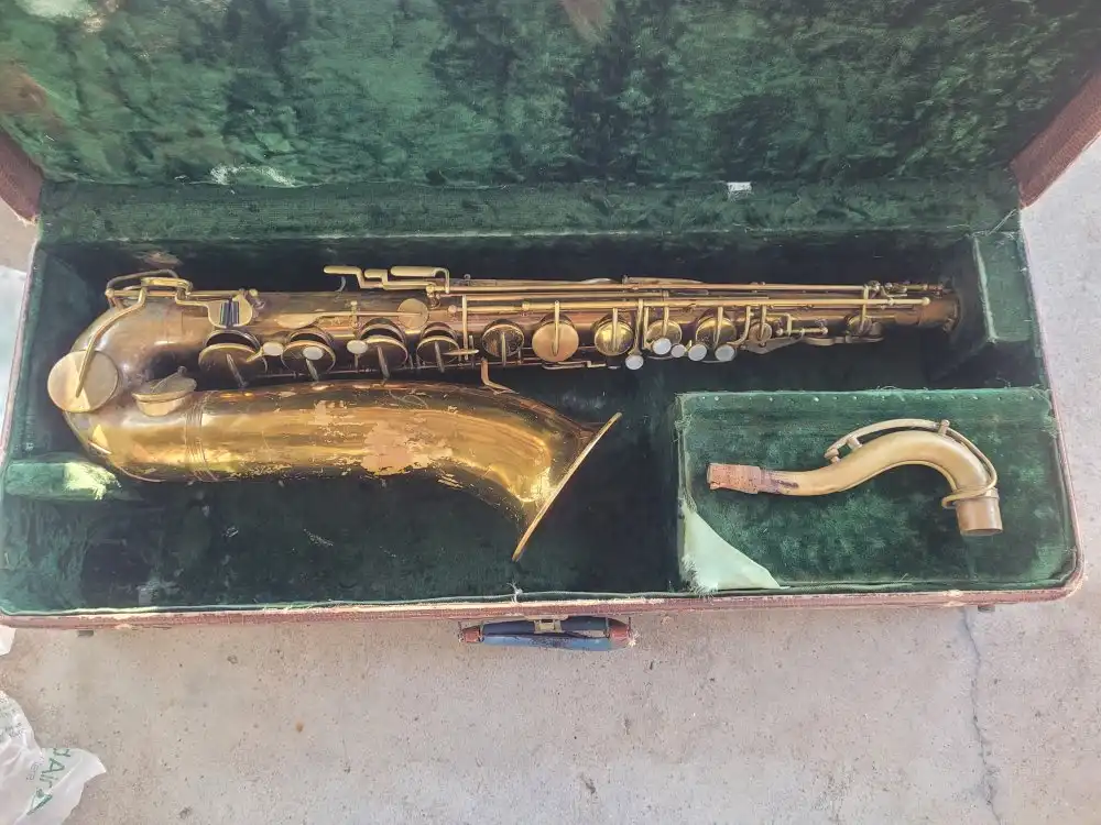 This is another Indiana tenor that I cleaned up. I believe circa 1953 It was in such bad condition that I used a matte finish to help hide just how bad the bell was. The case stenciling tells me that it has been a school sax and from the look of it the bell has been crushed and straightened back out. The second pic is of it and the other Indiana by Martin tenor that is my usual sax. You can kind of see in the third pic and Indiana alto circa 1952-53 behind this tenor upstairs where I practice.