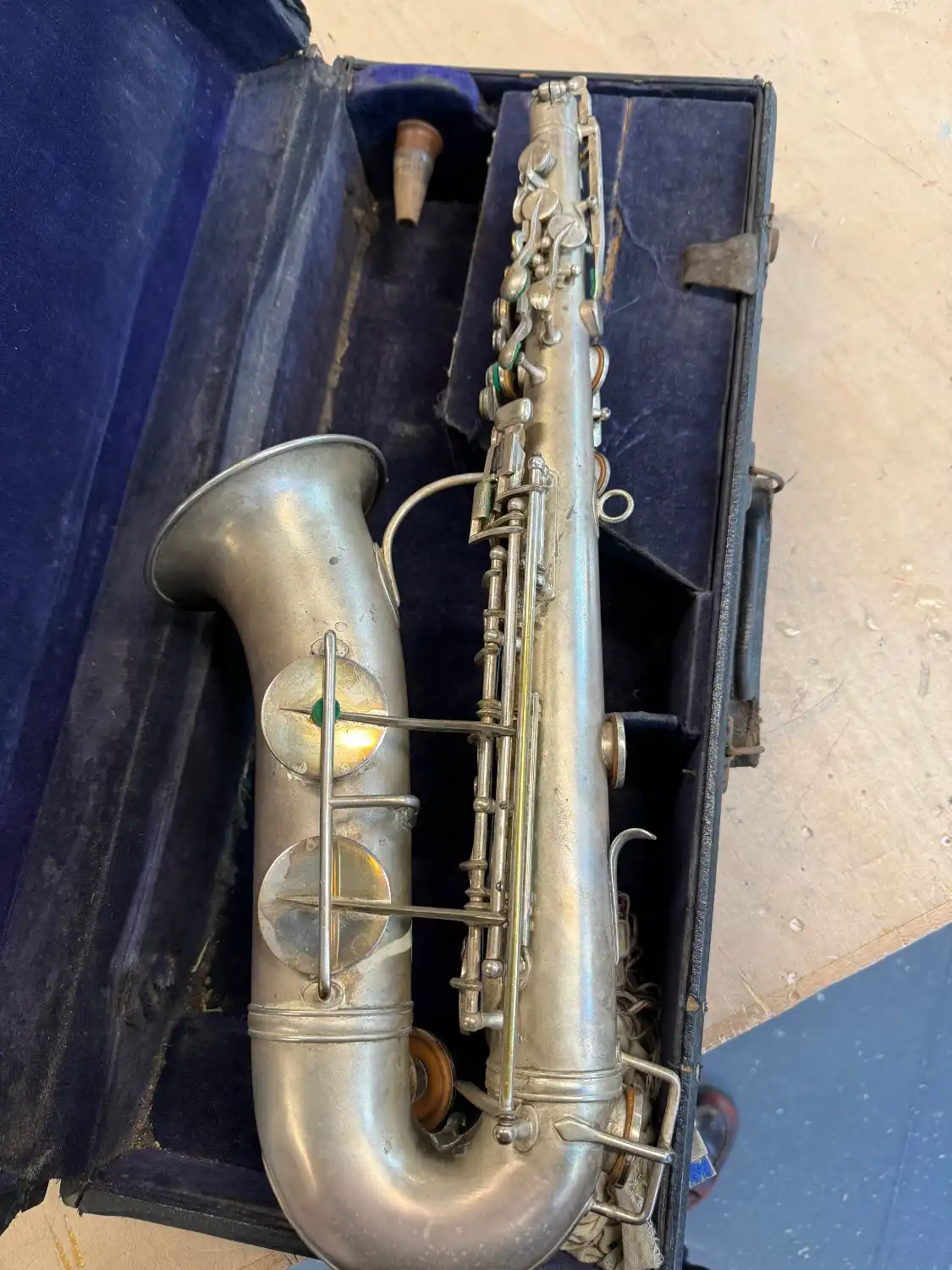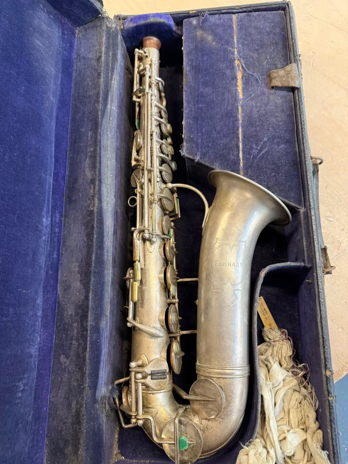 I have been trying to identify this alto sax. It has a very distinctive upward curve support between the bell and body and both Bb and B pads are on the same side. The Elkhart logo is in a star with a point on top and bottom, no other engraving is present. Looking at horns of a similar age and serial number I just can't seem to find it. Any ideas?